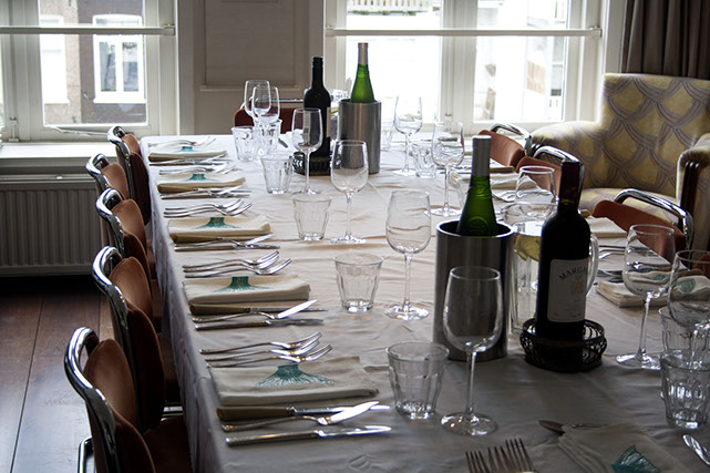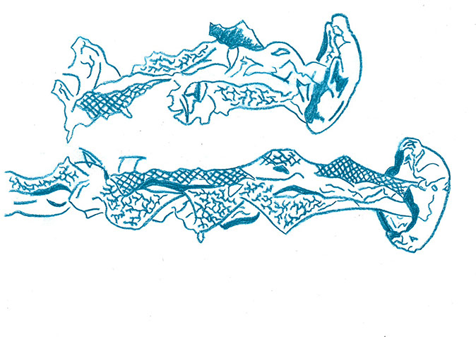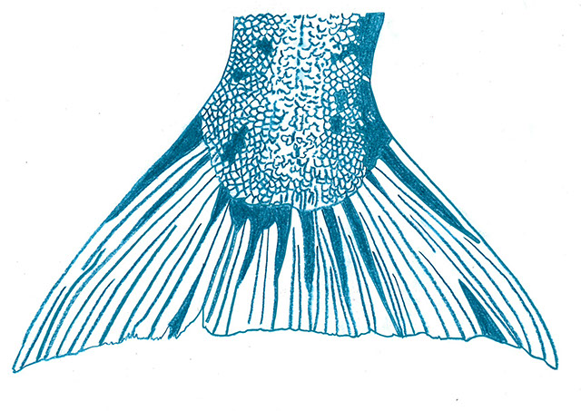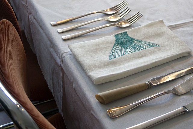 | NAPSKIN 2 Vervolgens heb ik een nieuwe serie gemaakt en heb ik me laten inspireren door het onderwater rijk. Na het maken van verschillende schetsen kwam ik uit op een geschubde vissenstaart ook deze grafische voorstelling is gemaakt op een borduurmachine. De vissen staart bevind zich op de rand van de servet, alsof de vis van de servet afzwemt.